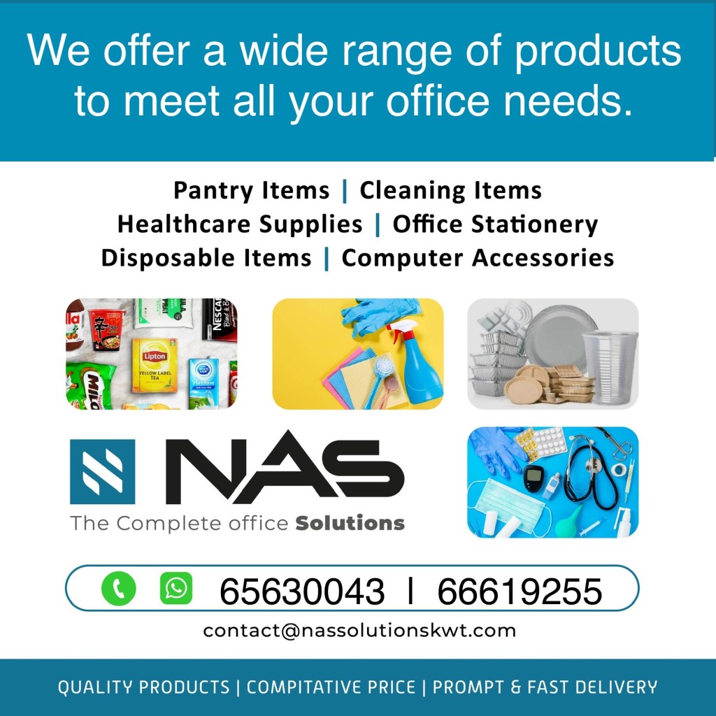 At Nas Solutions, we offer a wide range of products to meet all your needs. From pantry items to stationery, disposable, Computer Accessories and cleaning products, we have everything you need to keep your office well-stocked.